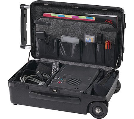 Our latest interior design has all the external features and benefits of the Standard Porter Case, plus special internal enhancements that convert it into a mobile office on wheels for the professional on the go. The lid, the Computer Case has a briefcase style accordion-portfolio that when unsnapped, will fold out, allowing you to place files or folders in the three pockets in back. The front of the portfolio has 5 pockets and pouches of various sizes to store your CD's, discs, hand calculator, markers, pens, etc. In the bottom, there is a larger high density cloth covered foam ring 17.5" X 13.5" X 4.5" high with a semi-rigid adjustable divider, two cloth covered foam blocks 12" long x 1.5" wide x 2.75" high. The ring will adjust larger notebook computers and/or many Digital projector sizes. It will accommodate large size notebooks. As always, the patented CART feature is there to help carry 200 pounds of other baggage on top. Airline Regulation carry-on size. Made of durable space age materials. Features 4" ball bearing wheels at a solid 3/8" and 42" solid steel axle. The padded telescope handle and exterior tie down strap allow for easy and hassle-free travel. Secondary reinforced side strap handle. Interior dimensions: 21.5"x13.25"x7". Read more...