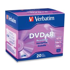 Verbatim DVD+R offer 4.7GB or 120 Minutes of write-once storage capacity, superior recording quality, and compatibility with 1X to 16X DVD+R writers. Verbatim's 16X cutting edge technology allows users to record a complete 4.7GB/120Min disc in approximately 5 minutes. Recognized as the choice for professional users, Verbatim DVD+R offers the optimal &ldquoAdvanced Azo” recording dye, which provides the highest level of read/write performance, reliability, and archival life. Verbatim 16X DVD+R media is compatible with Sony, Dell, HP, Compaq and other leading drive manufacturers. 1X-16X DVD recording speeds Advanced AZO recording dye optimizes read/write performance Ideal for recording up to 2 hours of DVD quality home movies and video clips Archive and back up, up to 4.7GB of important data Compatible with 16X DVD+R drives from Sony, Dell, HP and others Read compatible with most DVD-ROM drives and DVD video players Limited Lifetime Warranty Read more...
